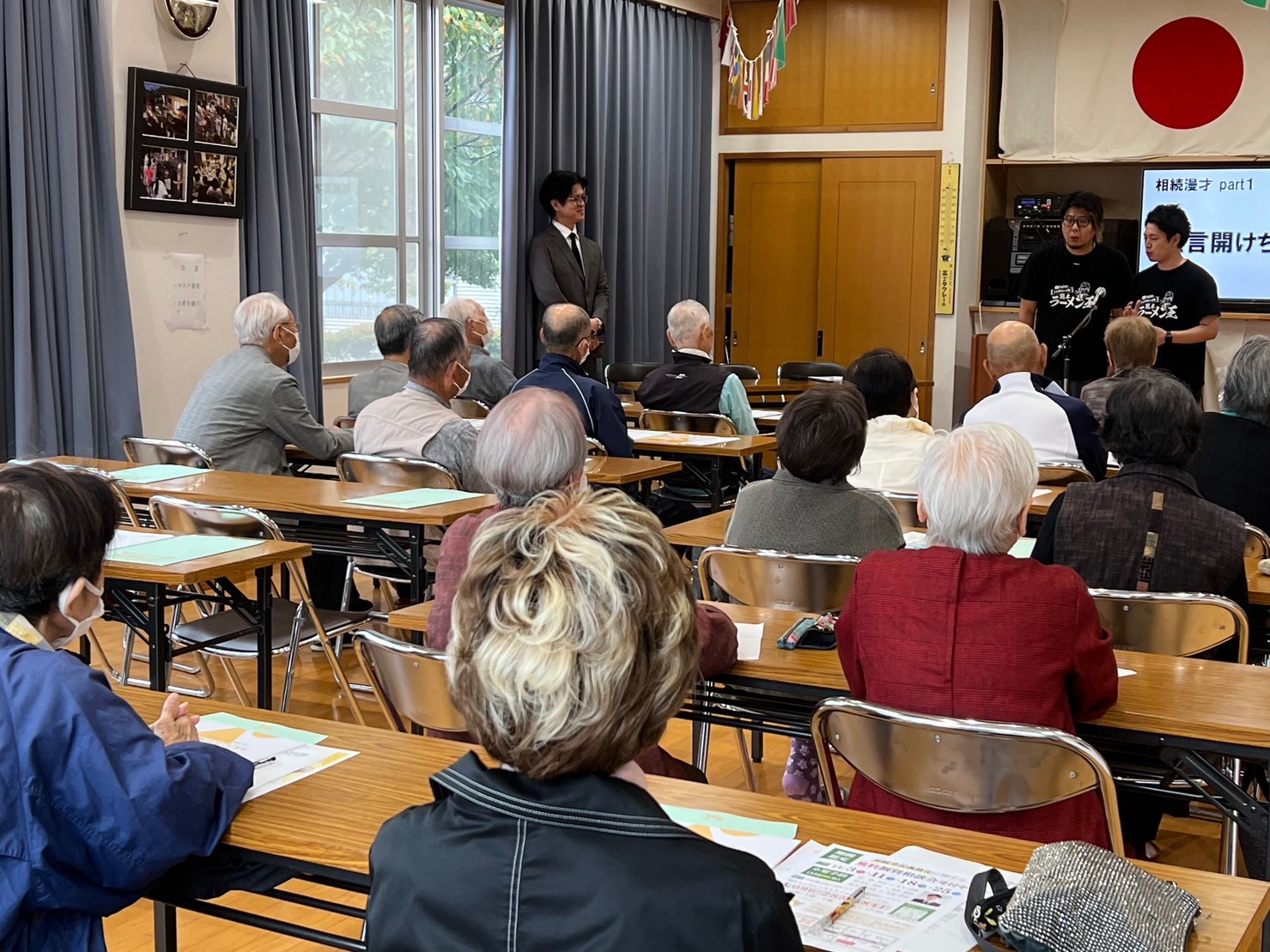 あかりテラスでは、縁起でもないと後回しにされがちな相続の問題について、明るく前向きに学んでいただき、早めに準備していただこうと、熊本のお笑い芸人さんとコラボした「相続漫才」を、毎月、葬儀場や地域の公民館で開催しています。